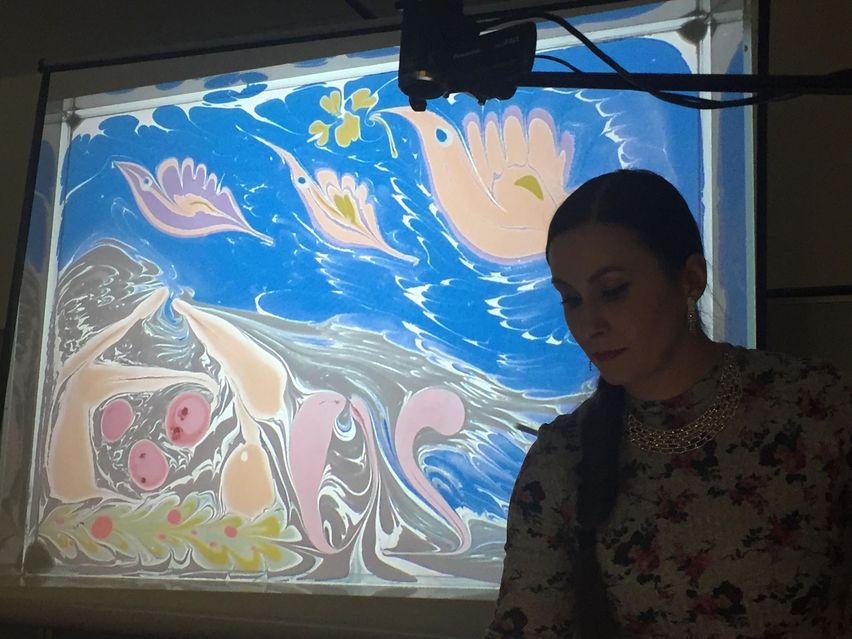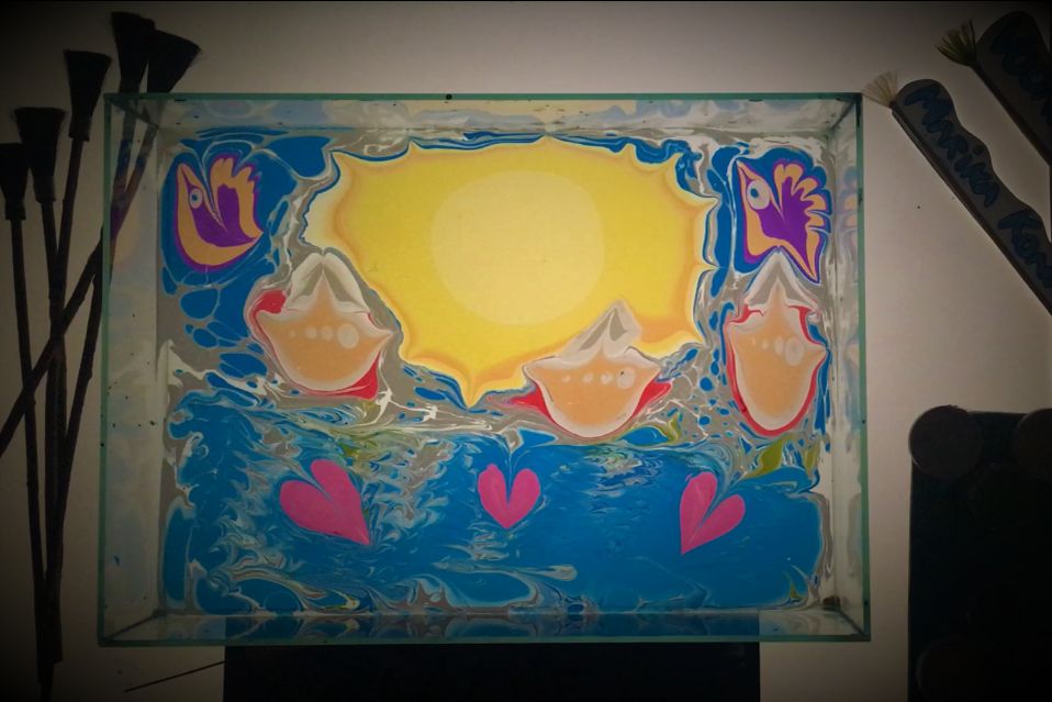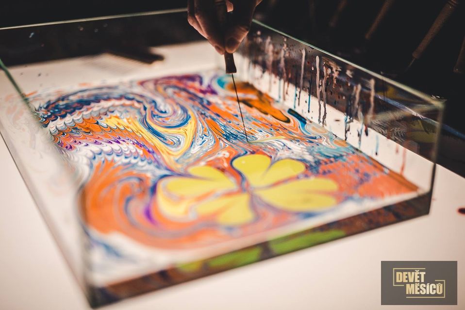 na vodní hladině. Celý proces se snímá kamerou a promítá na plátno, vše doprovází příjemná hudba.